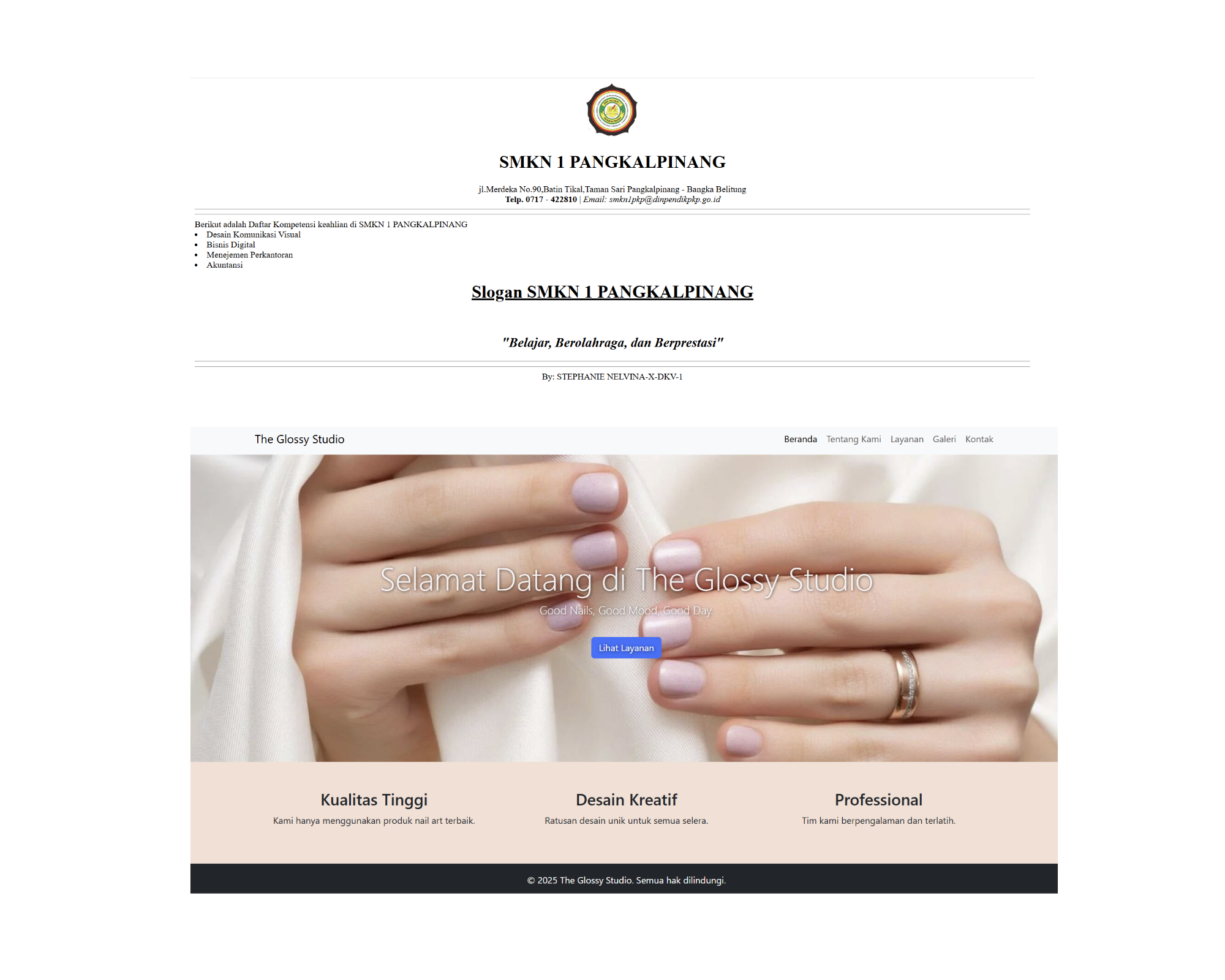 Perkenalkan nama saya Stephanie Nelvina kelas X DKV 1 saya salah satu siswi SMK NEGERI 1 PANGKALPINANG ini adalah portofolio yang saya buat dan di bawah ini adalah daftar karya saya di berbagai mata pelajaran.